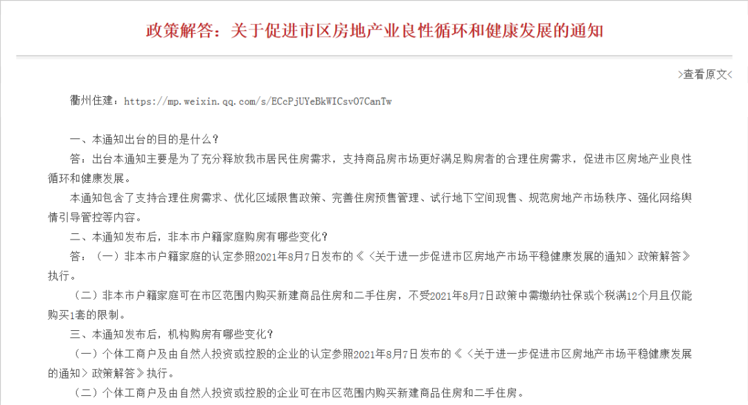 4月1日,浙江省衢州市住建局发布《关于促进市区房地产业良性循环和健康发展的通知》(以下简称通知)。《通知》明确,非衢州户籍家庭、个体工商户及由自然人投资或控股的企业,视同衢州户籍家庭执行相关购房政策。