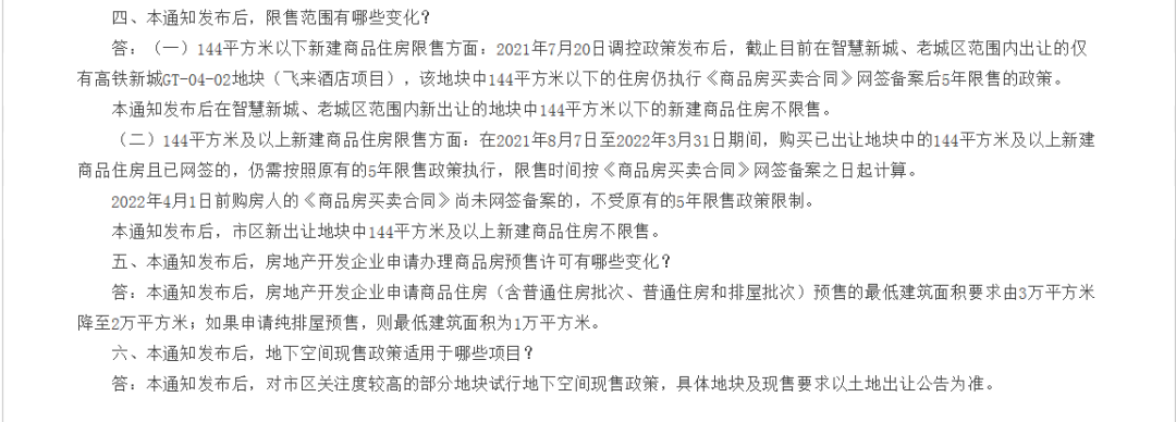 为坚持“房子是用来住的、不是用来炒的”定位,支持商品房市场更好满足购房者的合理住房需求,促进市区房地产业良性循环和健康发展,现就有关事项通知如下:非本市户籍家庭、个体工商户及由自然人投资或控股的企业,视同本市户籍家庭执行相关购房政策。本通知发布后市区新出让地块新建商品住房、已出让地块中尚未网签的144平方米及以上新建商品住房不限售,土地出让公告里有特别约定的除外。严格执行商品住房预售许可政策,除土地出让公告对预售规模作出特殊约定外,申请商品住房(含排屋)预售的,每期建筑面积不少于2万平方米;其中申请纯排屋预售的,每期建筑面积不少于1万平方米;尾期建筑面积达不到前述要求的,须一次性申请预售。在部分地块试行地下空间现售政策,具体以土地出让公告为准。落实“双随机、一公开”检查,加大联合执法力度,加强挪用预售资金、虚假宣传、二次改造等违法违规行为的查处,持续整治规范房地产市场秩序。加强网络平台、自媒体等媒介发布管理,正确引导舆论和市场预期,打击发布不实信息、恶意炒作、渲染恐慌情绪、误导市场预期等扰乱市场秩序的行为。本通知自发布之日起施行。此前相关政策措施与本通知不一致的,以本通知为准。