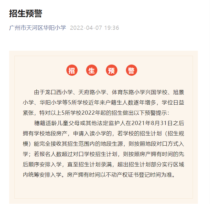 穗籍适龄儿童父母或其他法定监护人在2021年8月31日之后拥有学校地段房产,申请入读小学的,若学校的招生计划(招生规模)能完全接收其招生范围内的地段生源,则按照地段对口方式入学;若报名人数超过对口学校招生计划,则按照房产拥有时间的先后顺序安排入学,直*招生计划录满,超出招生计划部分实行区域内统筹安排入学。房产拥有时间以不动产权证书登记时间为准。