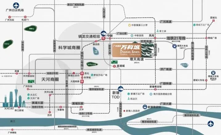 地铁方面:离北侧的21号线中新站约6.3公里,离南端13号线新塘站约13.4公里,未来暂无地铁规划经过新新大道...据规划后期项目交付后将开通楼巴接驳地铁。