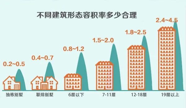 6、一般情况下,19层以上的高层项容积率基本在2.4—5之间,比较常见的高层楼高100米以内,容积率大概会在3.0—4.0左右。