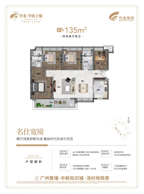建面约135㎡四房两厅两卫,约6.5米奢阔横厅设计,无过道浪费,南向全明四开间叠加超宽阳台,霸气向阳;三室全飘窗设计,目之所及皆是阳光美景。