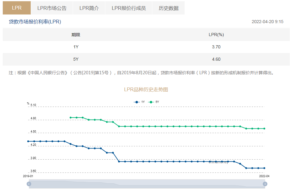 中国人民银行授权全国银行间同业拆借*公布,2022年4月20日贷款市场报价利率(LPR)为:1年期LPR为3.7%,5年期以上LPR为4.6%。4月两个品种LPR均与上月持平。*此,LPR已连续3个月维持不变。