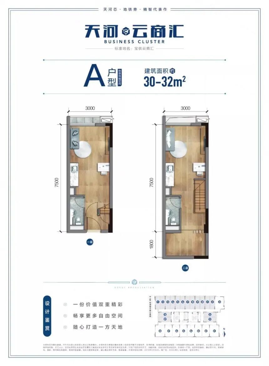 创意空间,灵活多变,可随心打造。例如对创业一族来说,人手有限,办公室租金又太高,那么不妨来一套天河云商汇,一层打造自己的个性化工作室,二层可用来作息。
