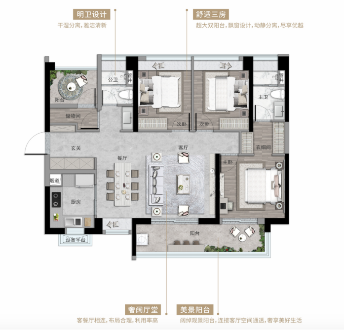 打造厨房-餐厅-客厅-阳台这一游动线,趣味划分出活动区,为家庭提供一个有趣的互动场景。餐厅飘窗+连接阳台,公共空间更加敞亮,让业主享受更好的通风、采光,感受阳光健康生活。G型厨房+西式岛台,满足不同的烹饪需求,打开厨房门,一个人在厨房做饭也能与家人朋友有更多的交流。超大主卧套间还连接阳台,让鲜氧与暖阳常伴,将江海景观揽入室内,与自然互动。采光*好的南向空间则留给了家里的孩子和老人,让孩子拥有更好的成长空间,老人有更健康的居住空间。