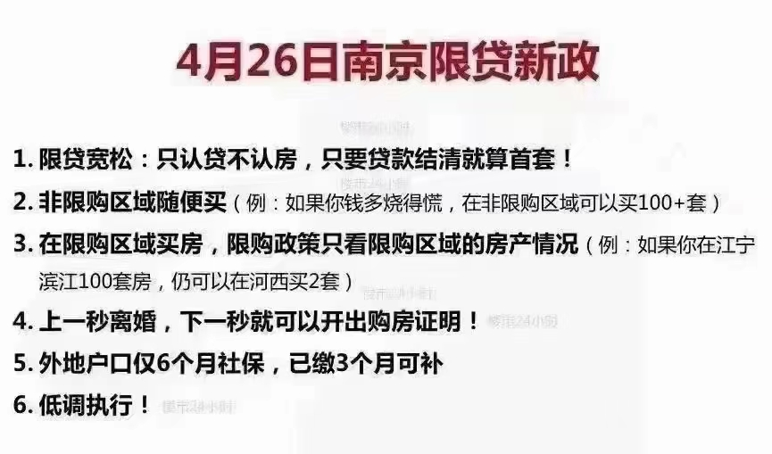 就在4月26日,南京传放松限贷,只认贷不认房,非限购区域随便买;4月23日放宽区域限购,南京户籍可买第三套,单身可买两套,外地人6个月社保即可购买!(网传版本,具体等官宣)