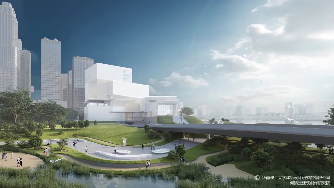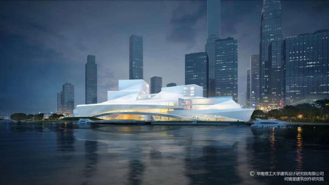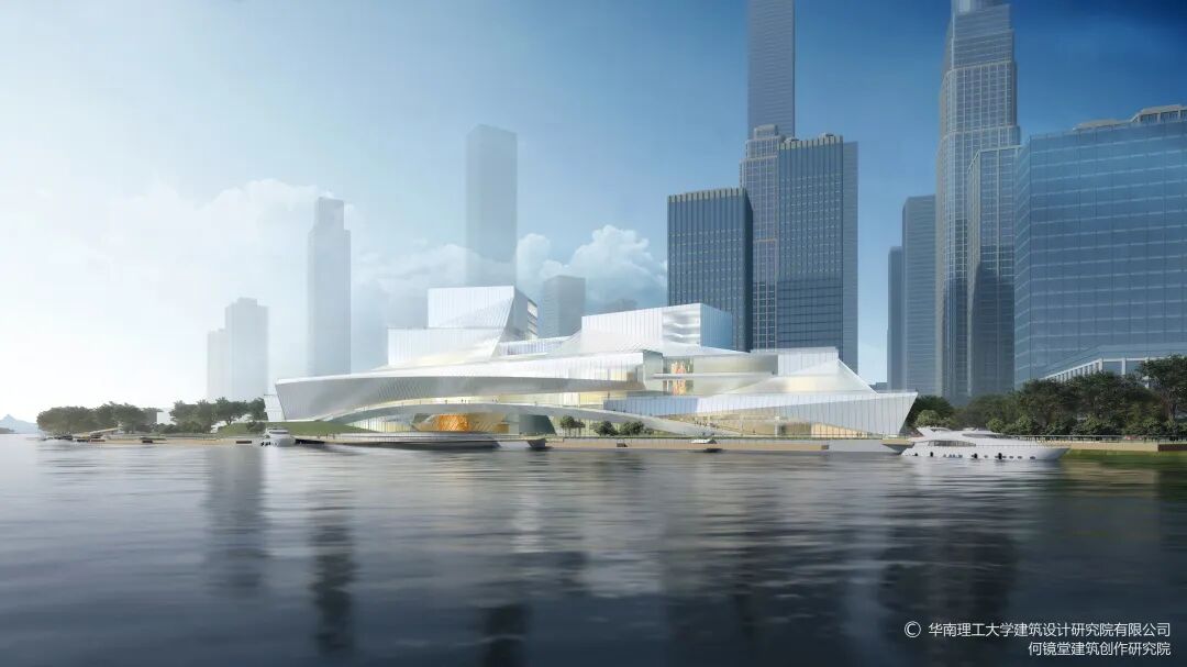 “三馆合一”项目由中国工程院院士何镜堂领衔的华南理工大学团队设计,采用“文化巨轮、时光拱廊、鹅潭写意、云山艺境”的设计理念,其外形宛如一艘轮船,建筑东西向长350米,高度呈30米*80米叠级而上,融合自然山水形态抽象写意与理性几何化建筑手法,塑造出滨水开放的大型公共空间。为给市民提供欣赏一线江景的平台,场馆一侧还设计有呈拱桥形、长约220米的观景步道。