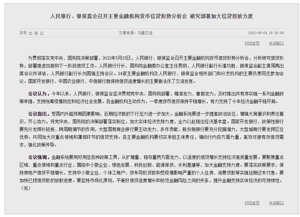 为贯彻落实党*、国务院决策部署,2022年5月23日,人民银行、银保监会召开主要金融机构货币信贷形势分析会,分析研究信贷形势,部署推进当前和下一阶段信贷工作。人民银行行长、国务院金融委办公室主任易纲,人民银行副行长潘功胜、银保监会副主席周亮出席会议并讲话,人民银行副行长刘国强主持会议。24家主要金融机构及人民银行、银保监会相关部门和分支机构的主要负责同志参加会议。国家开发银行、中国农业银行、中信银行就保持信贷适度增长的主要做法作了交流发言。