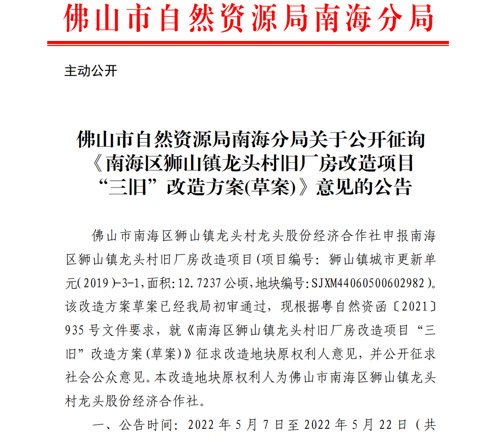 本项目取得进展已有先兆。回顾此前南海区政府网站发布了《南海区狮山镇龙头村旧厂房改造项目“三旧”改造方案(草案)》的征询公告。