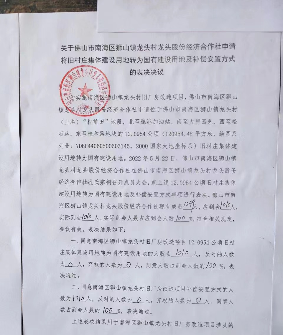 近日(5月22日),佛山市龙头股份经济社举行“狮山镇龙头村旧厂房改造项目集体建设用地转为国有建设用地”表决事项,*终获得了100%高票通过。