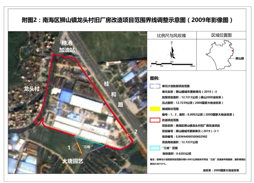 公告显示,狮山镇龙头村旧厂房改造项目的范围是:北*穗港加油站、南*大唐园艺、西*松石路、东*桂和路;总占地127236.74平方米,地块权利所属区狮山镇龙头村龙头股份经济合作社。
