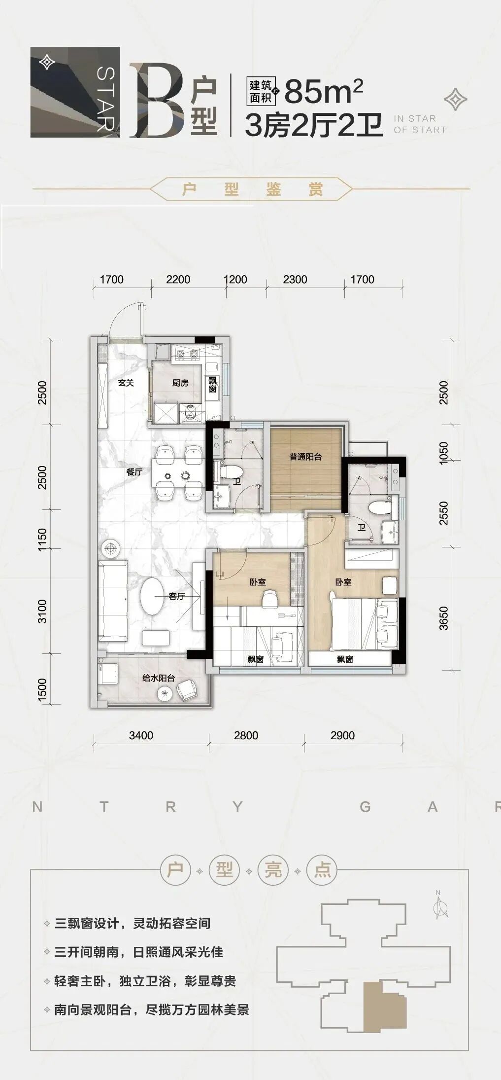 建筑面积约85㎡3房2厅2卫,户型利用率较高,无论是三口之家还是三代同堂,都可以轻松满足您的需求。