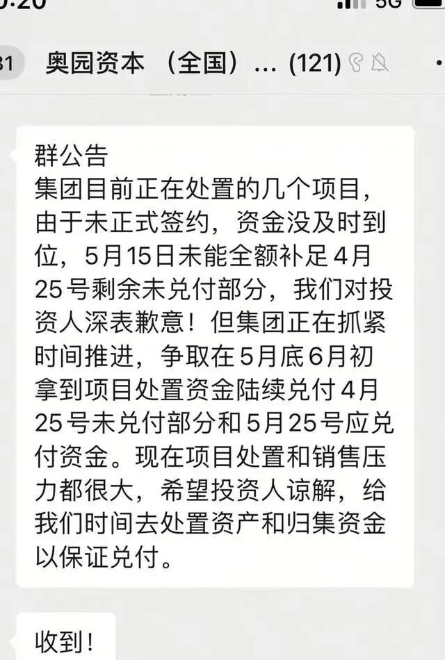 实际上,奥园金控在4月25日时已经无法足额兑付,集团目前正在抓紧处置项目,但是处置进度缓慢,销售也没有回款,希望投资人体谅。争取在5月底6月初拿到项目处置资金后兑付客户理财。截*今日,很多客户并没有拿到兑付款。