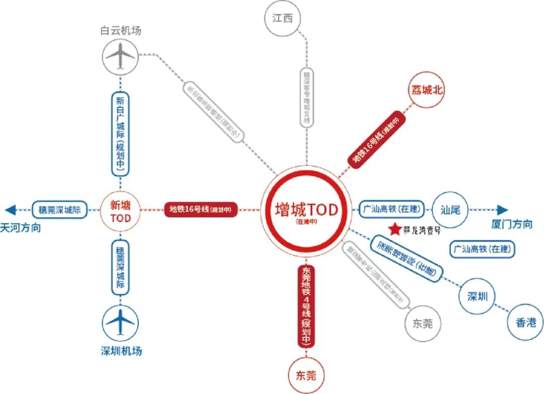 目前增城TOD已经初步形成汇聚2条地铁、1条高铁、1条城际、3铁路的交通网,未来能快速达到广州主城区,加入湾区生活圈。
