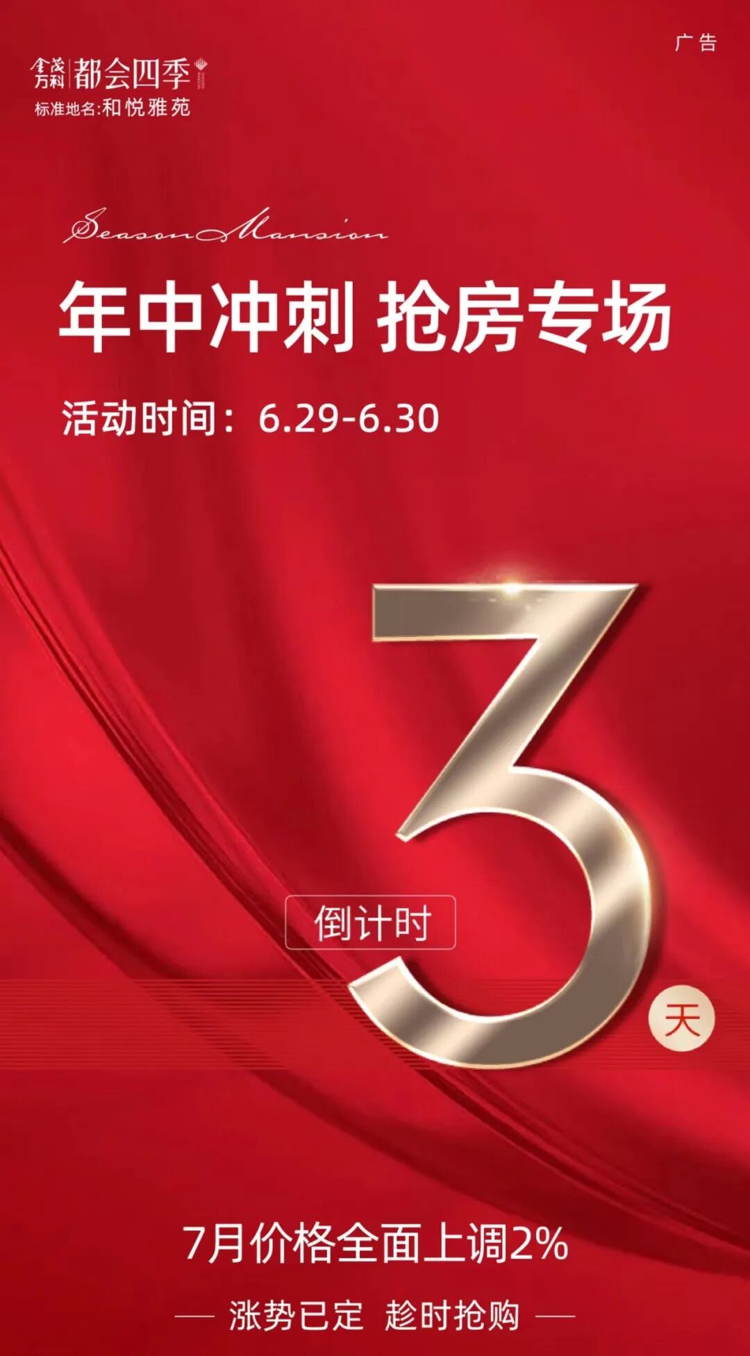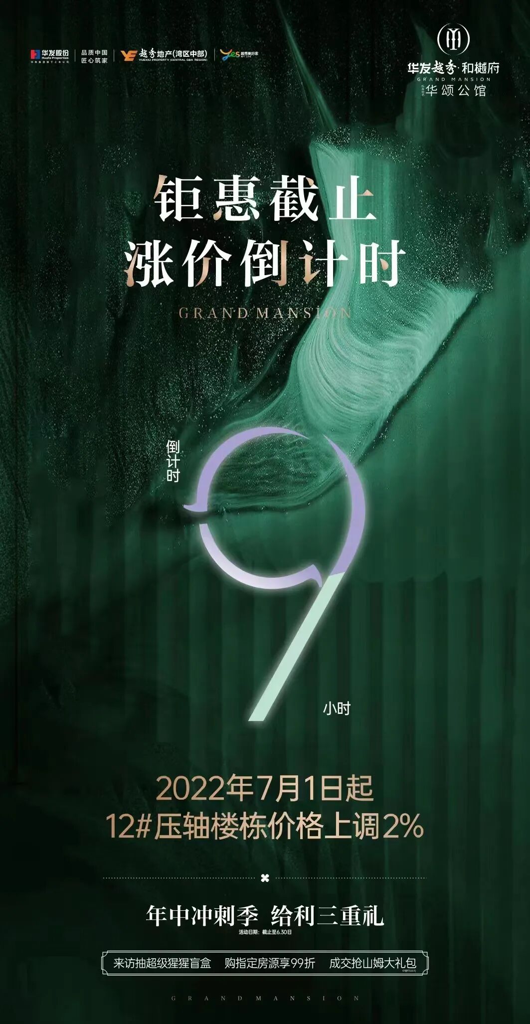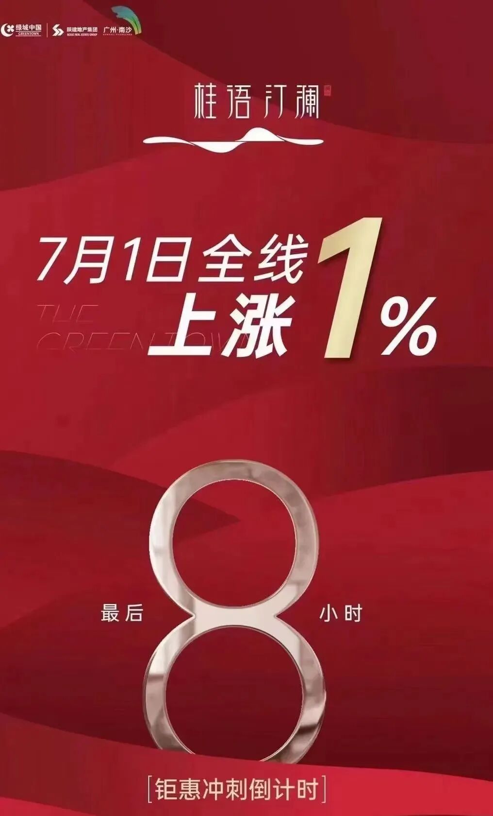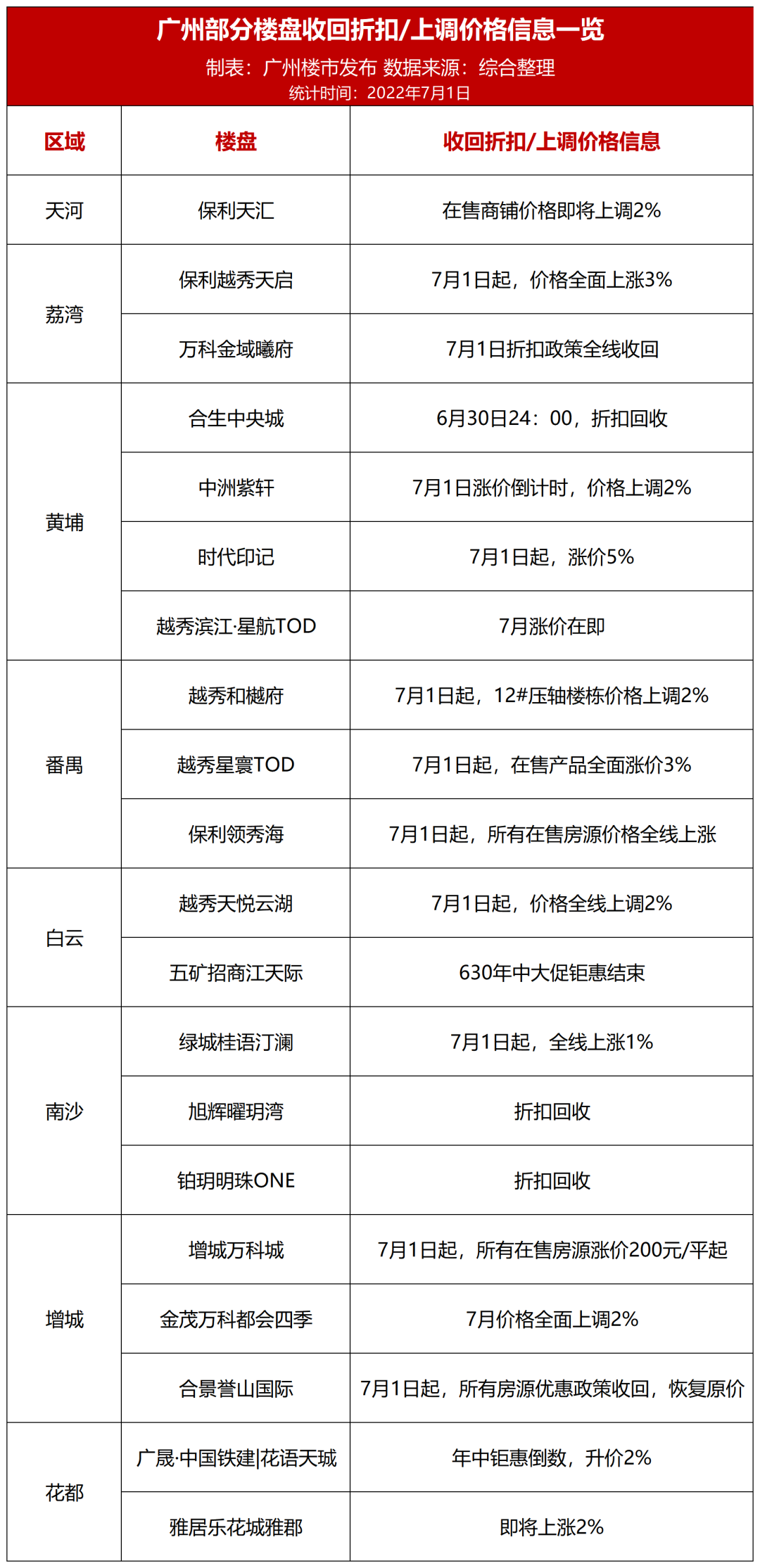 不完全统计,广州20家楼盘齐刷刷发布涨价公告:7月1日起,取消优惠,上调价格。其中不乏保利天汇、万科金域曦府、越秀和樾府等流量热盘,*高有盘喊话涨价5%!楼市风向,瞬息万变。价格,往往刺激着购房者的神经。今天,广州20家楼盘集体纷纷以海报、公告等不同方式,宣布收回折扣、上调价格!