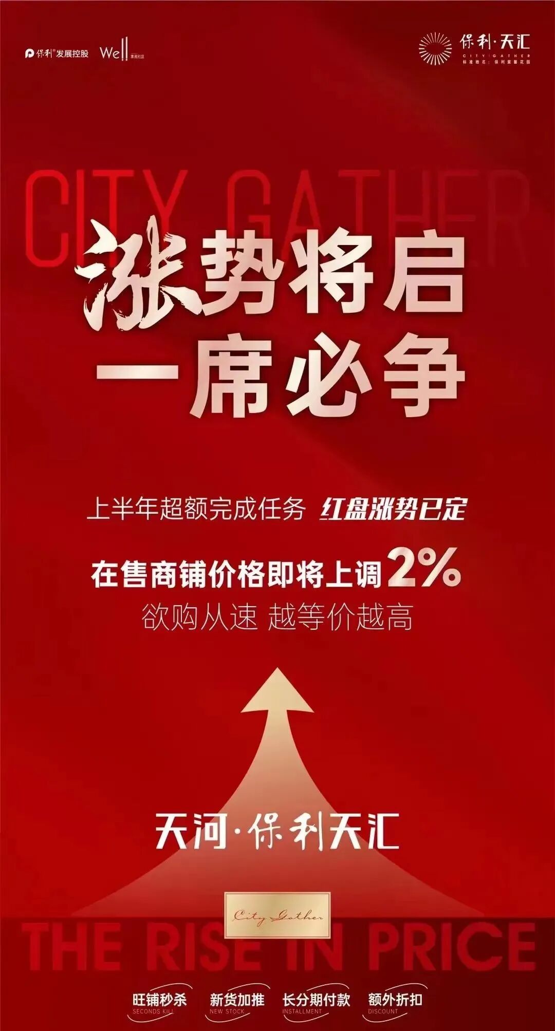 涨价的理由相当一致:年中冲刺一过,优惠活动就要截止了!天河流量选手——保利天汇,自入市以来一直热度不减。目前项目推出建面约25-139平的商铺产品。根据海报显示,项目上半年超额完成任务,在售商铺价格即将上调2%!