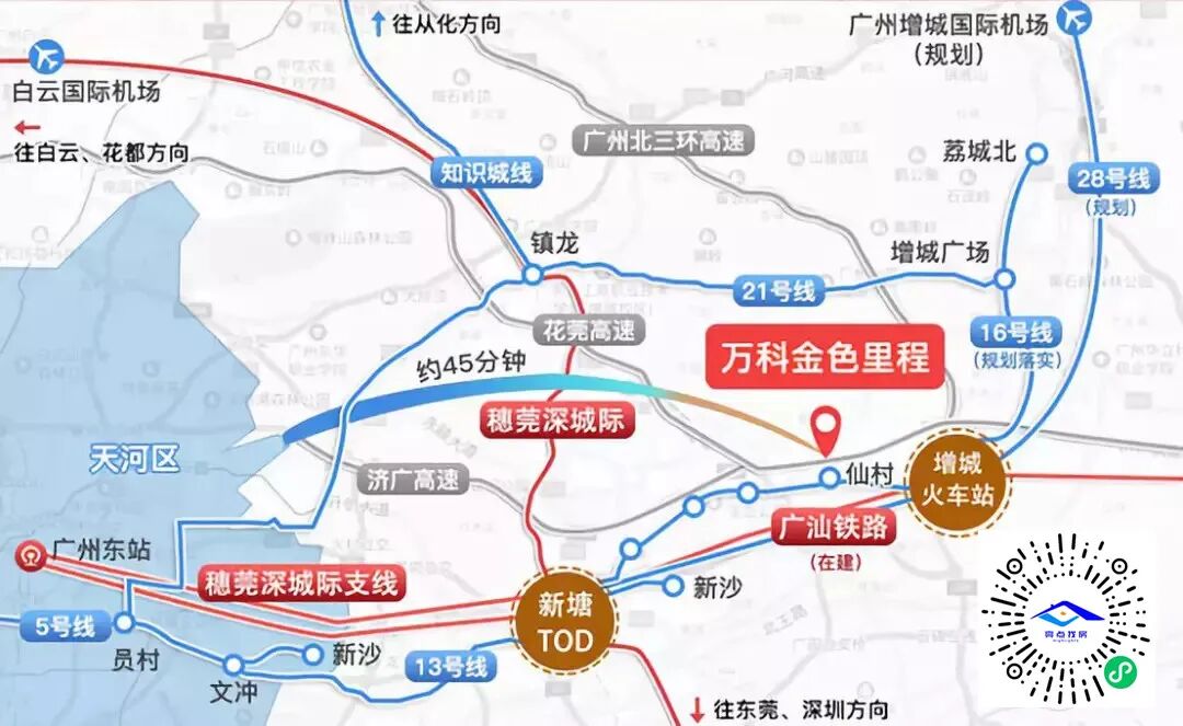 万科金色里程,不限购,位于广州新塘TOD宜居新区,享受东部TOD交通枢纽及国家经济开发区的规划利好。项目紧邻济广高速出口,可快速直达天河、黄埔;近地铁16号线仙村站,届时4站到TOD。出门可以快速到达新塘万达和荔城万达,享受双万达商圈;3公里内有仙村国际高尔夫球场及33万方五叠岭森林公园,具有*的生态资源。内部规划有六大球场,满足全家人的运动方式。