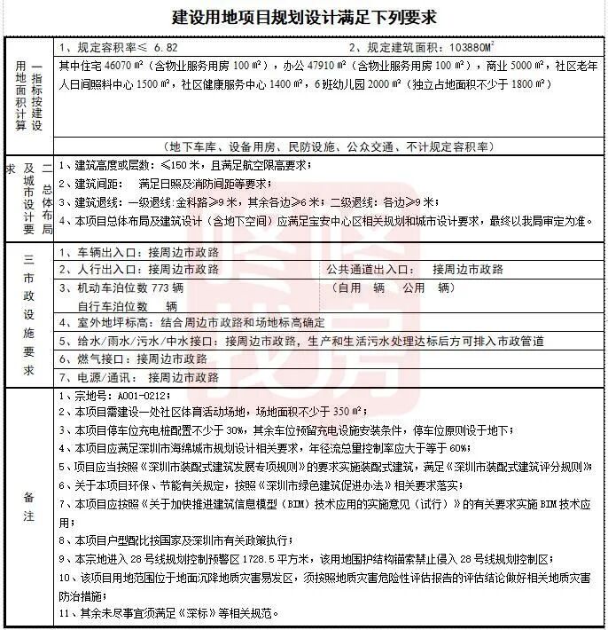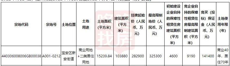 6、宝安新安街道A001-0212宗地:商业用地+二类居住用地,土地面积约15239平方米,建筑面积103880平方米,挂牌起始价28.29亿,*高限价32.53亿,普通商品住房平均销售价格不高于88600元/平方米。
