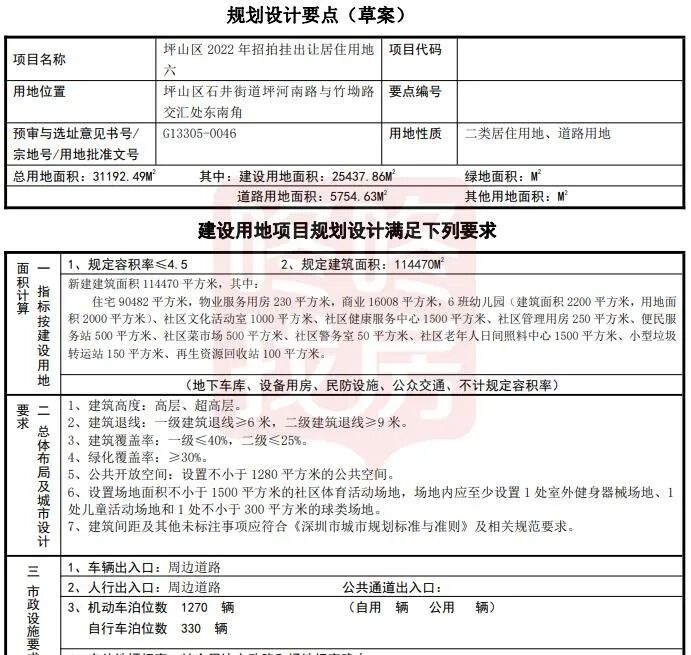 13、坪山石井街道G13305-0046宗地:二类居住用地+道路用地;土地面积31192.49平米,总建面114470平米,挂牌起始价普11.19亿;建成后普通商品住房平均销售价格不高于37500元/平方米。