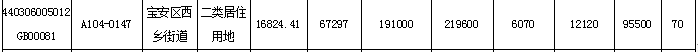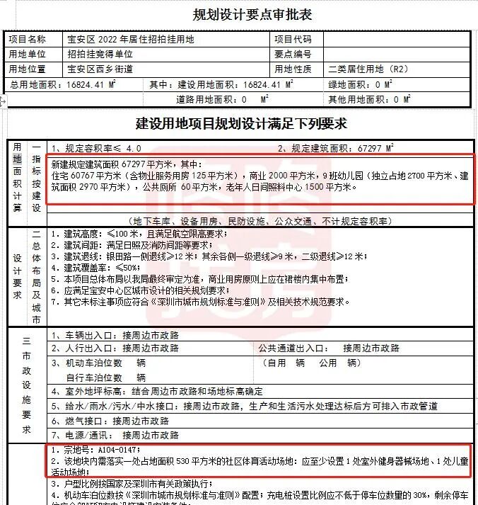 宗地号A104 - 0147,土地位置宝安区西乡街道,土地用途二类居住用地,土地面积16824.41平方米,建筑面积67297平方米,挂牌起始价1 91000万元,*高限制地价2 19600万元,初始建设无偿移交政府的公共租赁住房建筑面积6070平方米,竞企业自持的保障性租赁住房*高限制建筑面积1 2120平方米,土地使用年限70年。