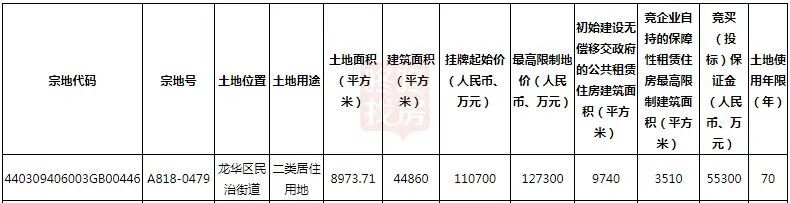 宗地号A818-0479,土地位置龙华区民治街道,土地用途二类居住用地,土地面积8973.71平方米,建筑面积44860平方米,挂牌起始价110700万元,*高限制地价127300万元,初始建设无偿移交政府的公共租赁住房建筑面积9740平方米,竞企业自持的保障性租赁住房*高限制建筑面积3510平方米,土地使用年限70年。