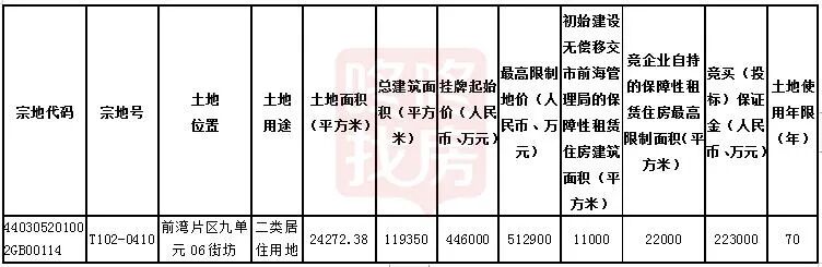 宗地号T102-0410,土地位置前湾片区九单元06街坊,土地用途二类居住用地,土地面积24272.38平方米,建筑面积119350平方米,挂牌起始价446000万元,*高限制地价512900万元,初始建设无偿移交市前海管理局 的保障性租赁住房建筑面积11000平方米,竞企业自持的保障性租赁住房*高限制面积22000平方米,土地使用年限70年。