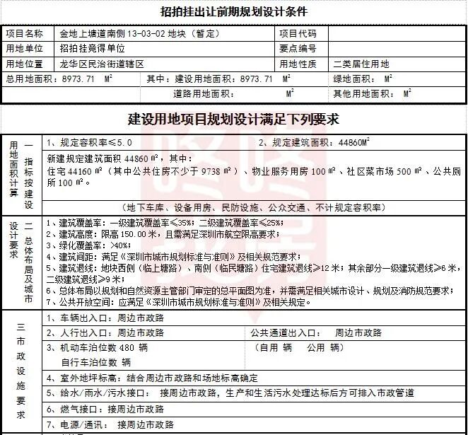 1、龙华民治街道A818-0479宗地:二类居住用地,土地面积约8973平,建筑面积44860平,挂牌起始价11.07亿,*高限价12.73亿,普通商品住房平均销售价格不高于73300元/平方米。
