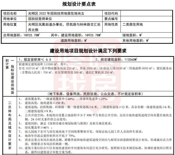 宗地号A503-0096,土地位置光明区凤凰街道,土地用途二类居住用地,土地面积18925.78平方米,建筑面积113560平方米,挂牌起始价211300万元,*高限制地价242900万元,初始建设无偿移交政府的保障性租赁住房建筑面积10350平方米,竞企业自持的保障性租赁住房*高限制建筑面积20700平方米,土地使用年限70年。