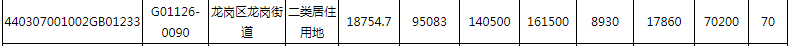 宗地号G01126-0090,土地位置龙岗区龙岗街道,土地用途二类居住用地,土地面积18754.7平方米,建筑面积95083平方米,挂牌起始价140500万元,*高限制地价161500万元,初始建设无偿移交政府的保障性租赁住房建筑面积8930平方米,竞企业自持的保障性租赁住房*高限制建筑面积17860平方米,土地使用年限70年。