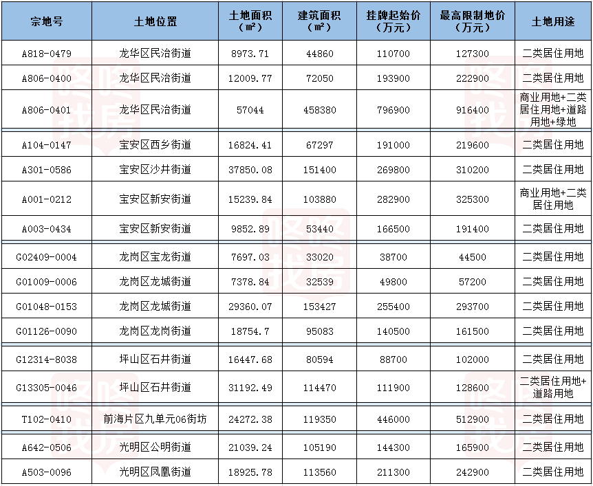 16、光明凤凰街道A503-0096宗地:土地面积18925.78平米,总建面113560平米,挂牌起始价21.13亿;建成后普通商品住房平均销售价格不高于48900元/平方米。