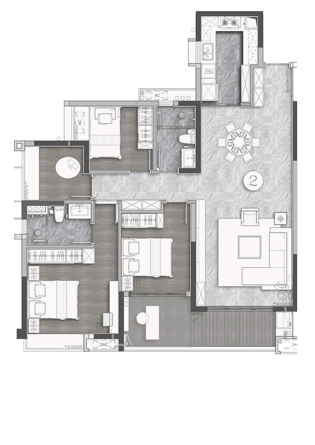 大尺寸感还体现在全屋的各个空间上,长U型的大厨房、超大主卧,还有三个阔绰的卧室房间。每一寸地方都是“含金量”十足,基本能覆盖家庭所需的方方面面。