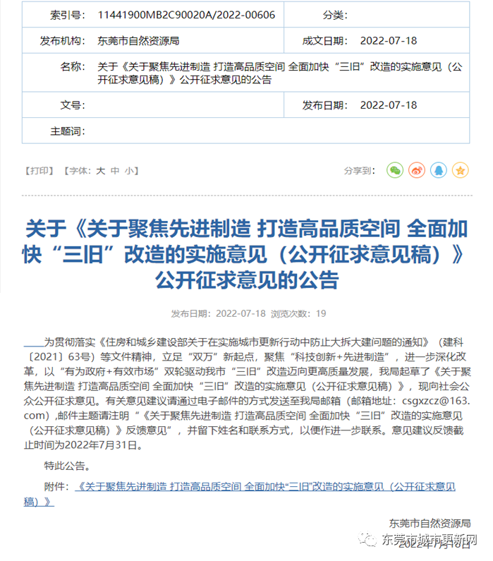 7月18日,东莞市自然资源局发布关于《关于聚焦先进制造 打造高品质空间 全面加快“三旧”改造的实施意见(公开征求意见稿)》公开征求意见的公告。
