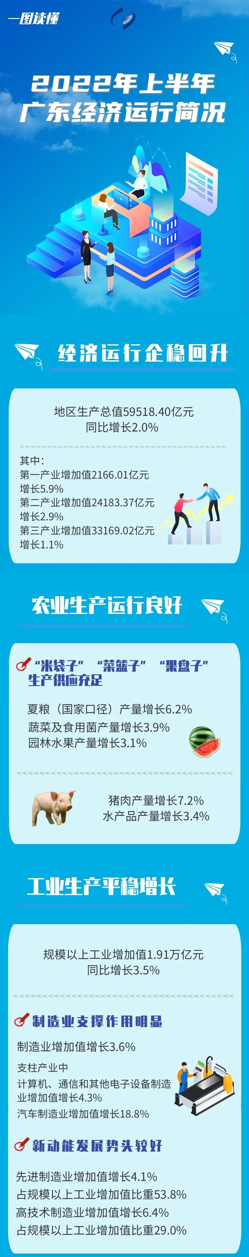 7月18日,广东省统计局发布2022年上半年广东经济数据显示,广东地区生产总值为59518.40亿元,同比增长2.0%。