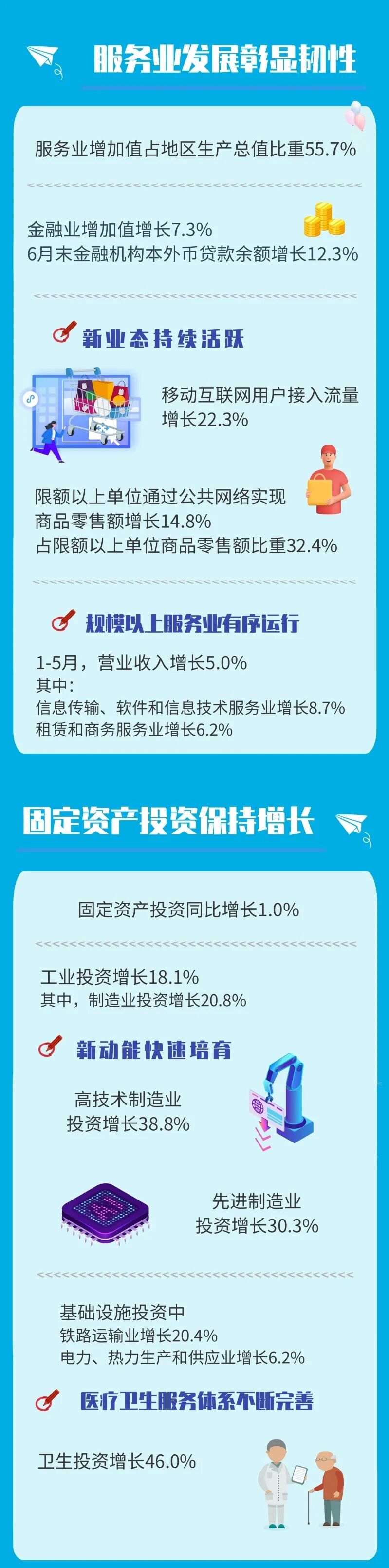 此外,规模以上服务业有序运行,1—5月,营业收入增长5.0%;其中,信息传输、软件和信息技术服务业增长8.7%,租赁和商务服务业增长6.2%。
