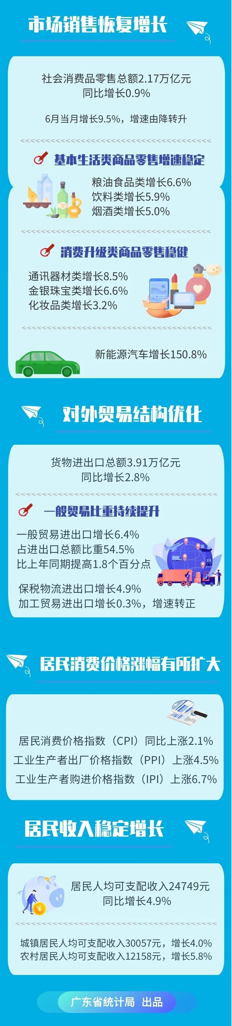 在对外贸易方面,上半年,广东货物进出口总额3.91万亿元,同比增长2.8%。