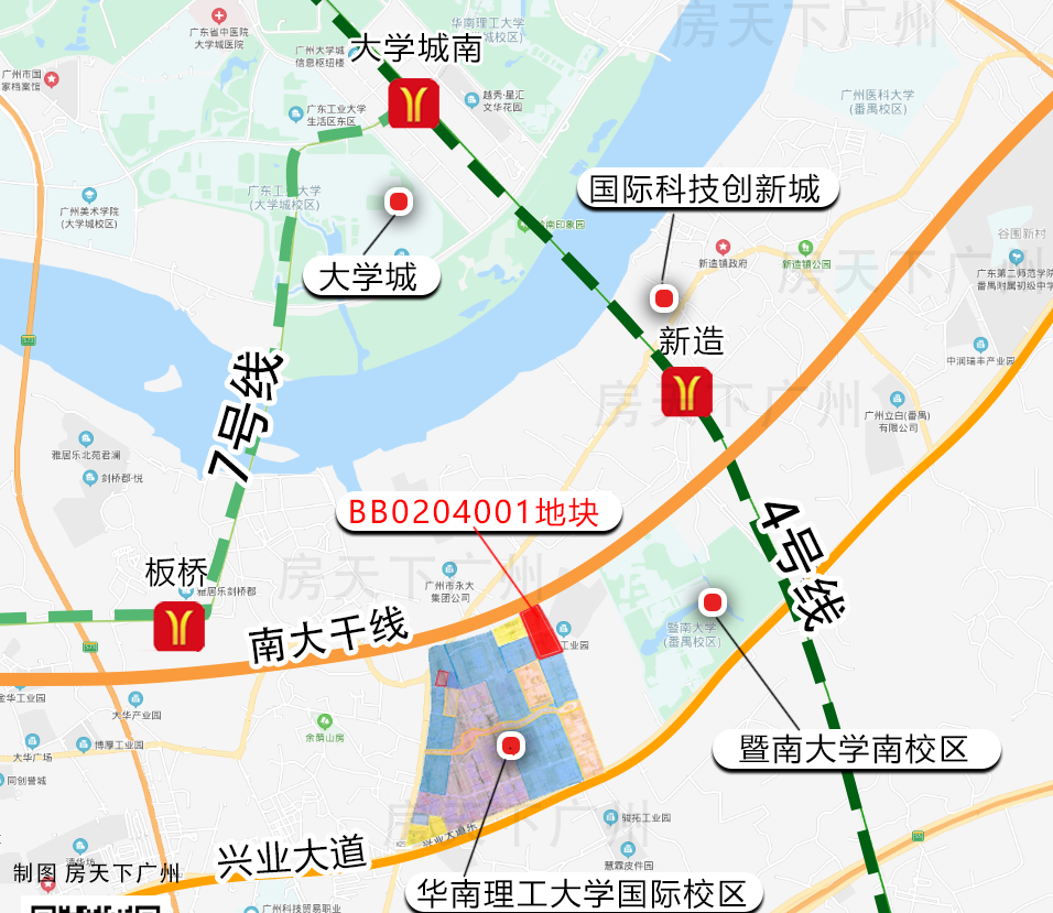 地块二北临市新公路,南靠南大干线与兴业大道,东临地铁4号线新造站,西侧为南沙港快速