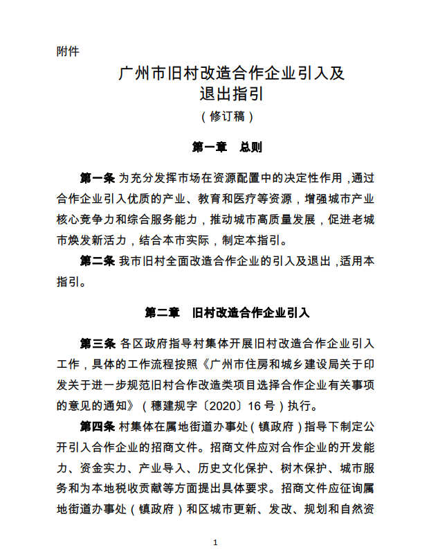 广州市旧村改造合作企业引入及退出指引 (修订稿)