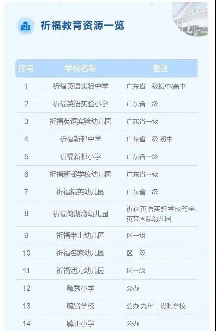 教育方面涵盖从幼儿园到大学预科的全年龄段教育,祈福英语实验幼儿园是广东*所*幼儿园,祈福英语实验小学是*小学,钟村中学是*中学等等,可以这么说,在祈福置业,就不用再担心教育问题。