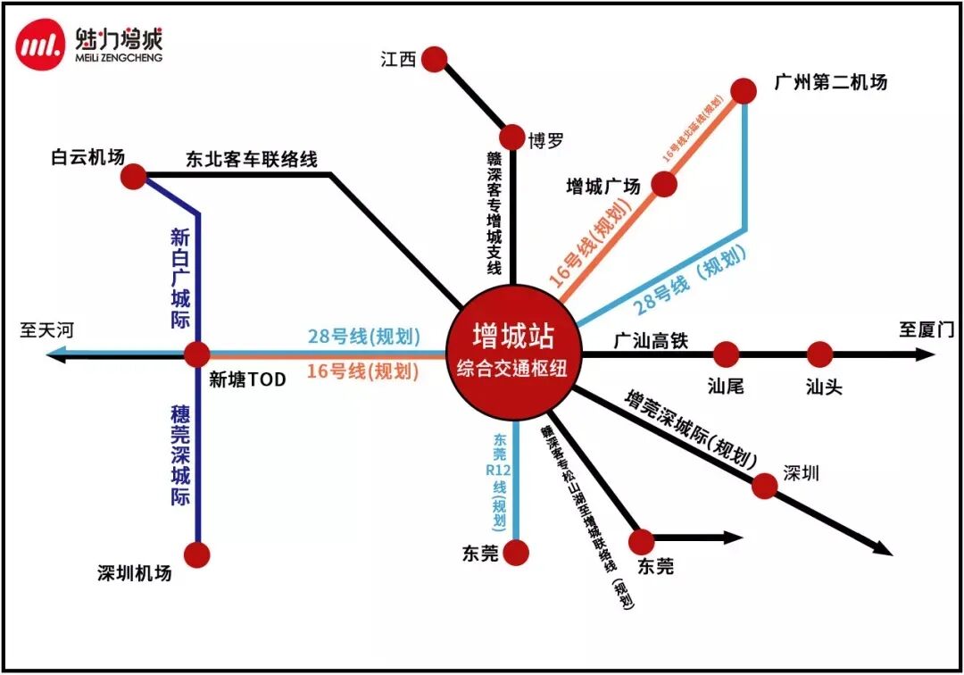 往北4公里,则是大家所熟知的广州新东站,石滩TOD项目。未来,遍布珠三角经济带的轨道路网将在这里汇聚: