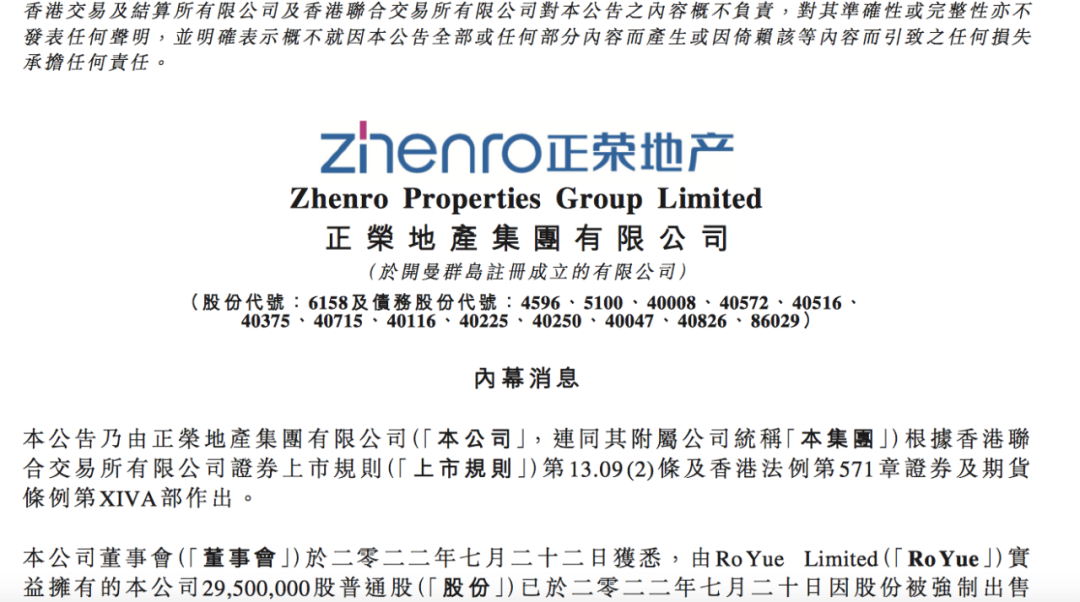 7月22日,正荣地产港交所发布公告,称7月20日,控股股东欧宗荣全资拥有的RoYue所持2950万股被强制出售,占本公告日期公司已发行股本总数约0.68%。转让后,RoYue共计持有20.50亿股,占正荣地产总股本的46.95%。且欧宗荣及其家族成员合共持有公司已发行股本总数约59.35%的权益,仍保持*控股地位。