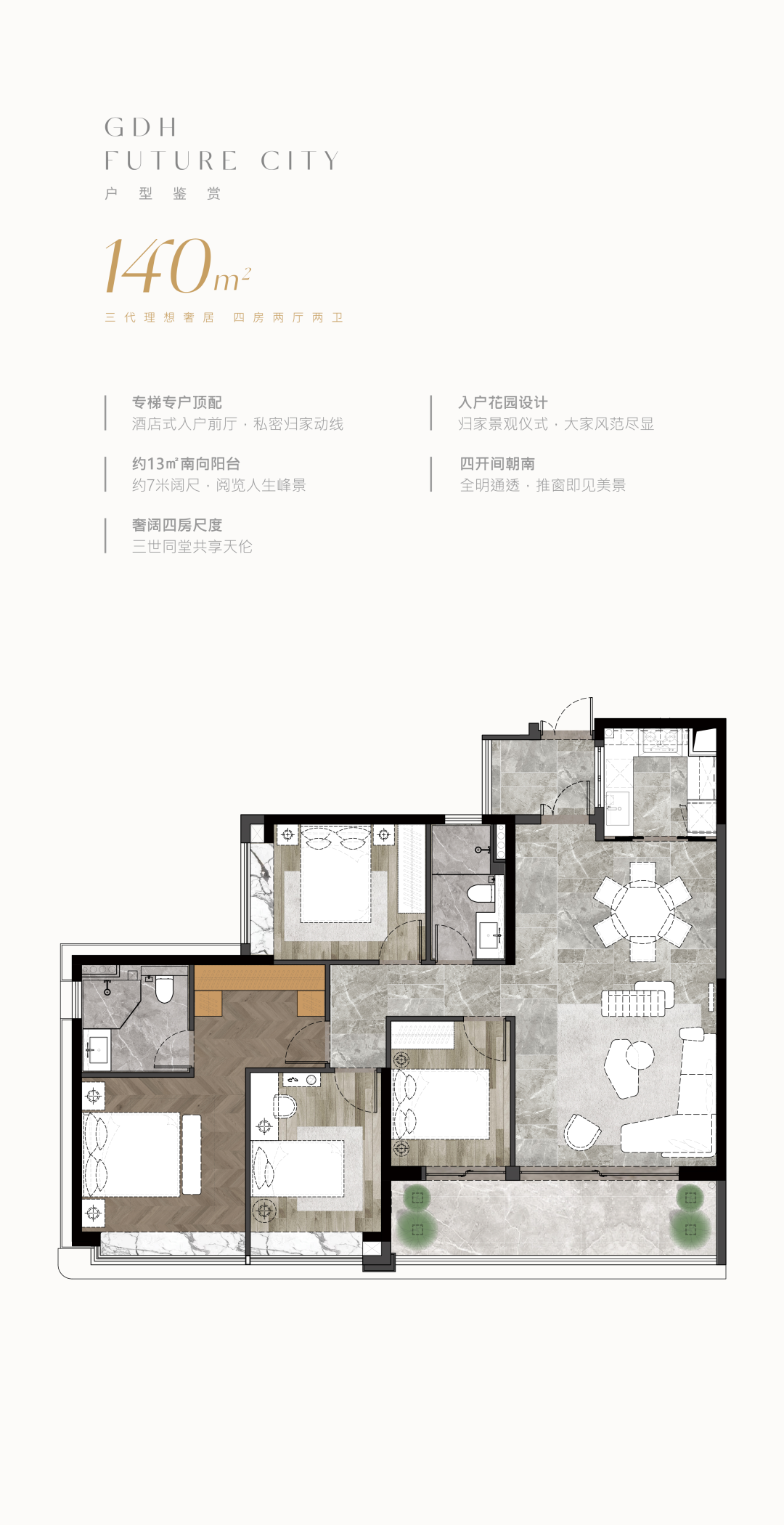 户型则包括建面约140㎡四房两厅两卫、264㎡四房两厅三卫、189㎡四房两厅三卫。
