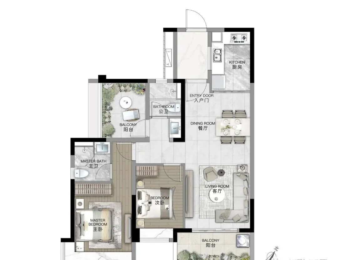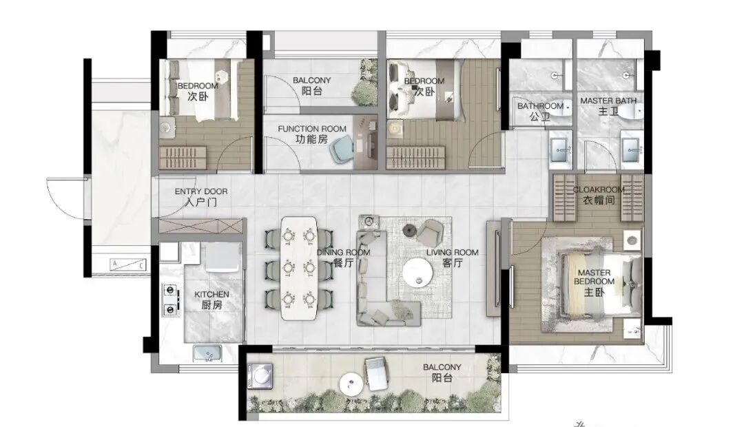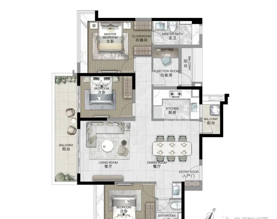 *于143平则是3号户型,同样是超大阳台设计,并且多出一个生活阳台,观景、晾晒两分离;主套空间更大,自成小世界,私密性强。