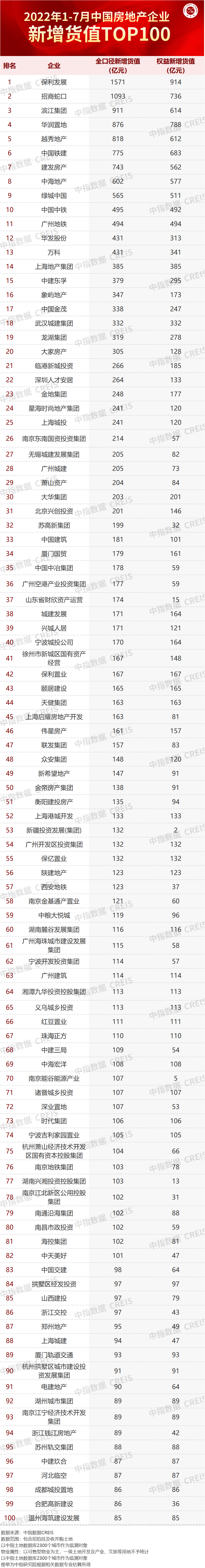 从新增货值来看,保利发展、招商蛇口和滨江集团占据榜单前三位。2022年1-7月,保利发展以累计新增货值1571亿元占据榜单*;招商蛇口和滨江集团紧随其后,累计新增货值规模分别为1093亿元和911亿元。*10企业1-7月新增货值总额8449亿元,占*100企业的36.5%,新增货值门槛为495亿元。