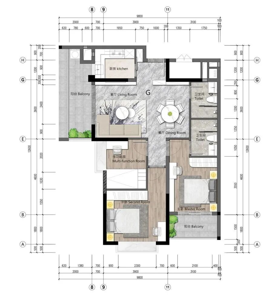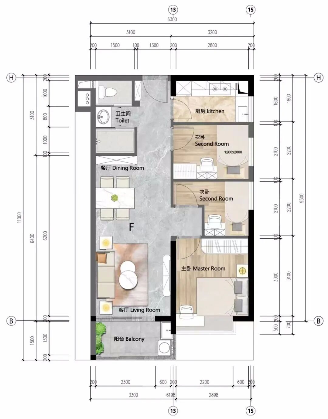 须要注意的是,这个户型在奇数楼层的话,东侧是一处名为“公共花园”的平台,也就是两个东向的次卧,开窗就可能看到邻居在活动,你细品。