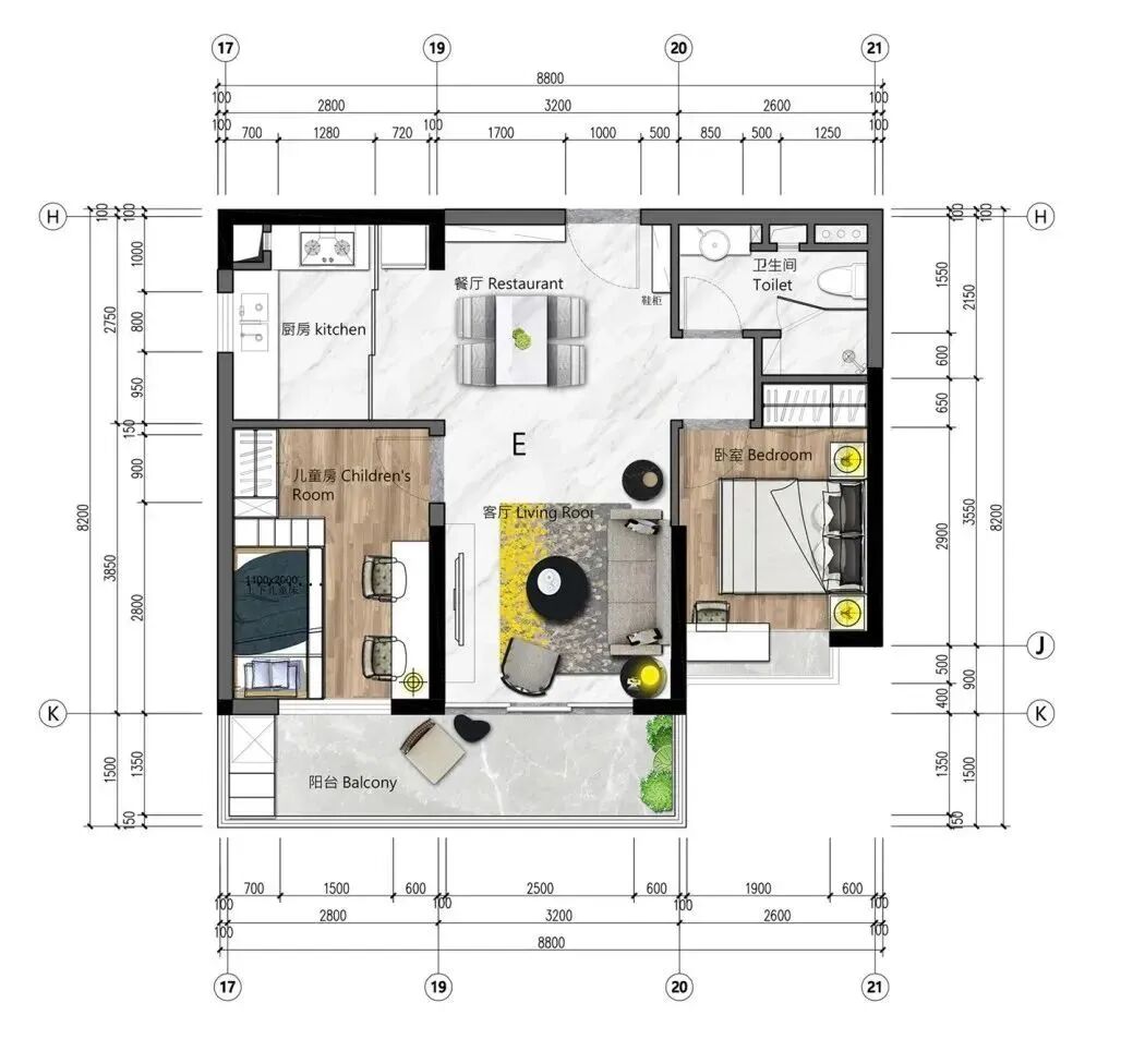 格局有点奇怪,厨房放在靠阳台正对卧室的位置,既影响客厅采光,又容易影响休息。但不放在这里,厨房也会变成暗房,就和入门处的卫生间一样。