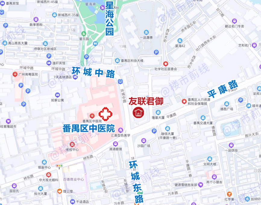 项目名为友联君御,位于番禺市桥的环城中路、平康路交汇处,属于番禺的旧城区地段。