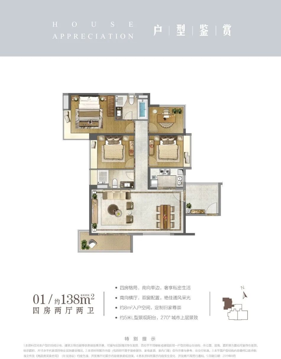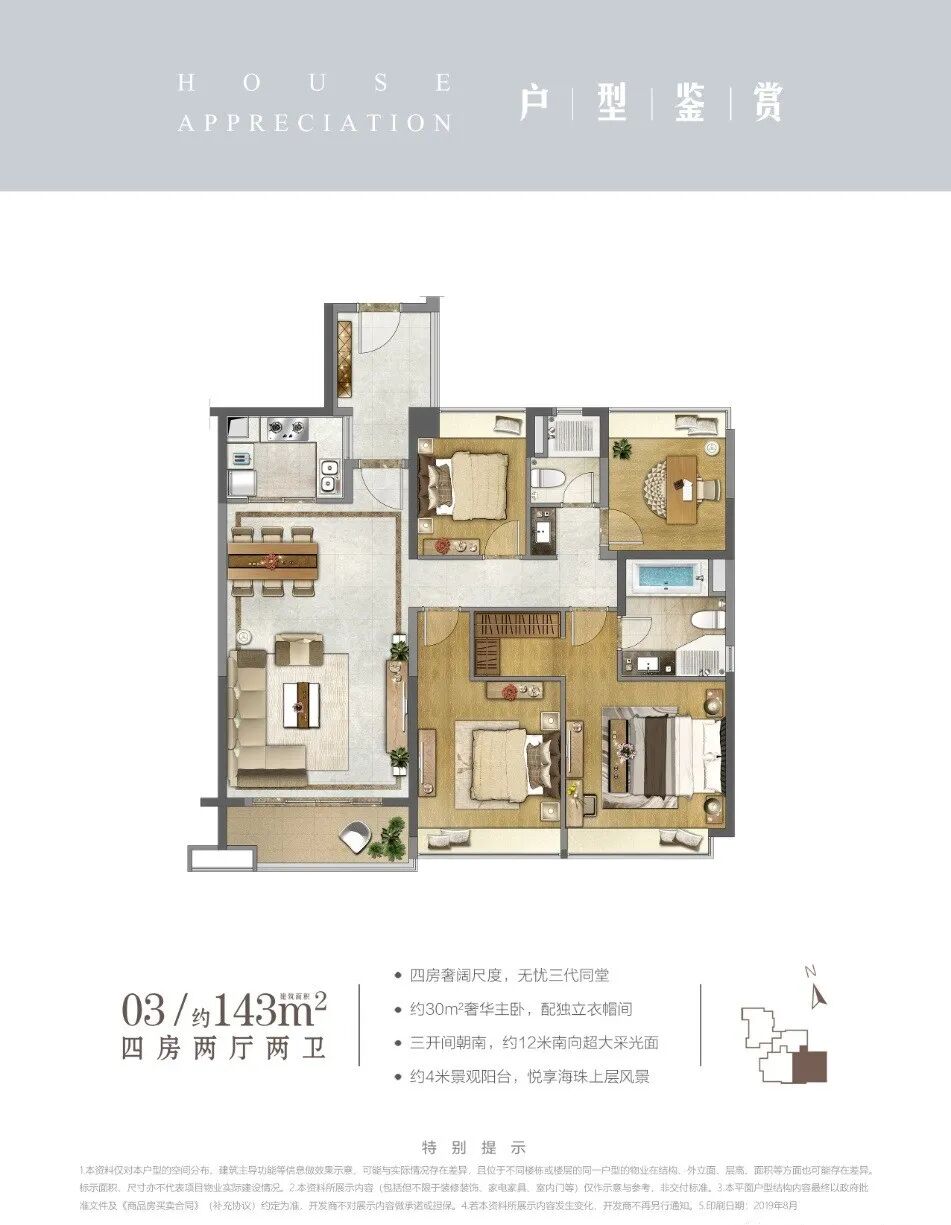 143㎡的户型四房两厅两卫,竖厅设计,南北通风对流,东南朝向。三个户型之中,户型*为方正,赠送面积*多,布局空间*为合理,四个房间全飘窗,视野开阔。厨房的窗朝入户花园,日后的排烟通风较差。整体户型设计,满足改善需求。
