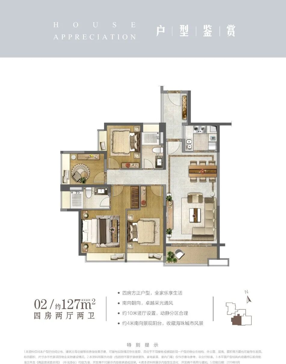 127㎡的户型西南向,竖厅设计,四房两厅两卫,基本满足1家3-4口人的居住需求。四个房间面临西晒,带入户花园。厨房的窗朝入户花园,日后的排烟通风较差,整体户型常规,较为宽敞舒适,南北对流,满足改善需求。
