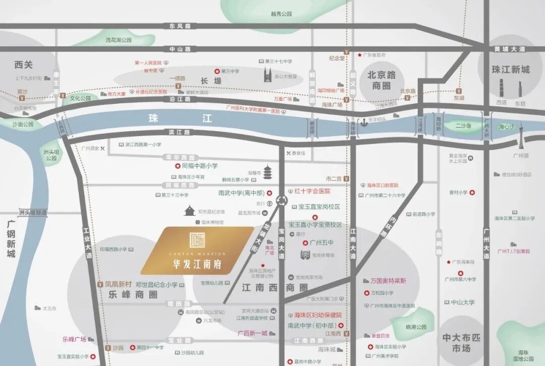 海珠*便捷的交 通 路 网 , 三纵三横三桥瞬达全城包括有工业大道、宝岗大道、江南大道三纵,滨江西路、江南西、昌岗路三横以及海珠桥、解放桥、人民桥三桥。在公共交通方面,距离地铁 8 号线【凤凰新村】站仅 700 米步行五*即可到达,同时 1公里范围内还有 2 号线的【市二宫】及【江南西】站