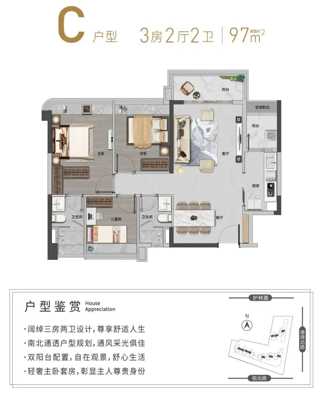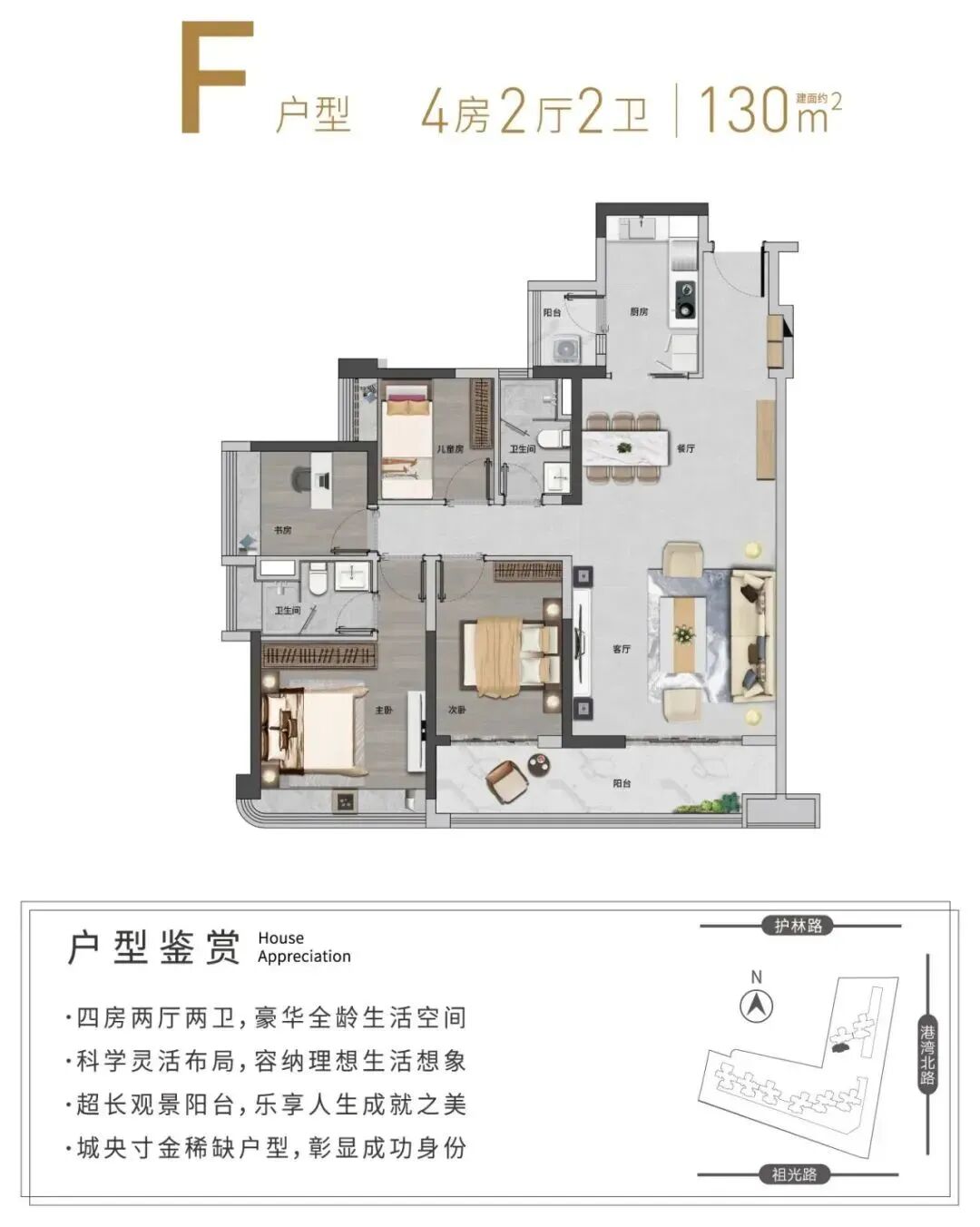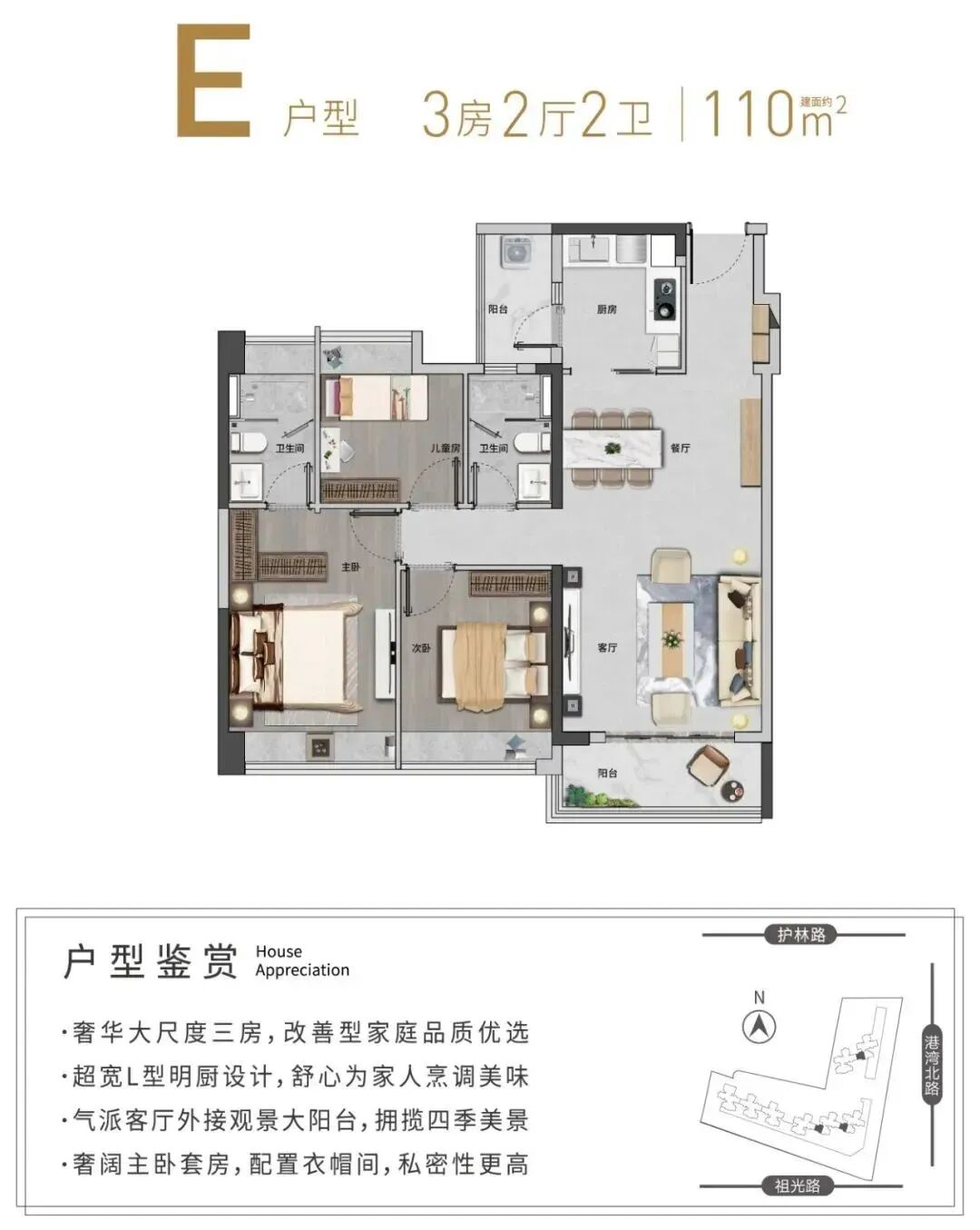 L型建筑布局,超宽楼距,南北朝向,采光充沛。装标臻选国内外知名品牌,以匠心手法,重塑舒居生活尺度。